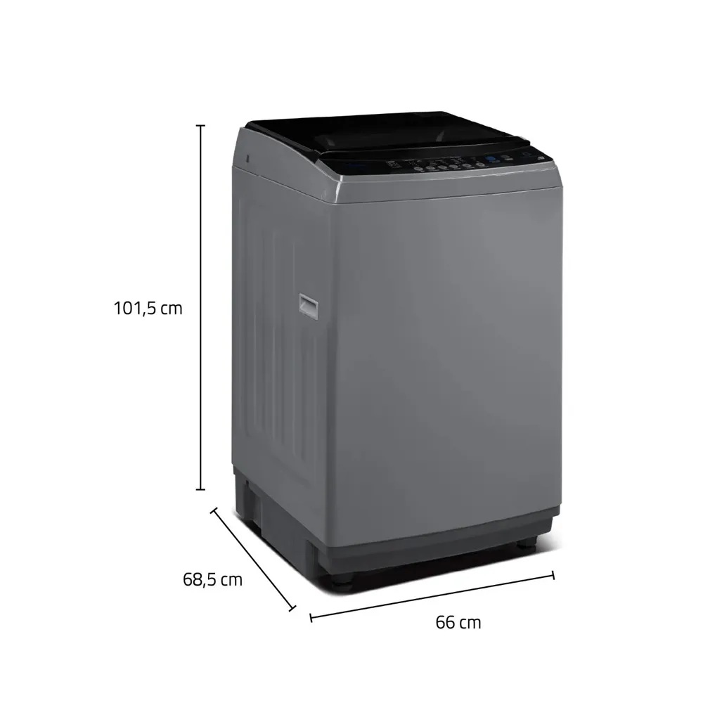 Carga: Superior, con tapa de vidrio templado, Programas de lavado: 8 ciclos preprogramados, Salida de agua: 8 niveles ajustables, Temperatura: 3 niveles (fría, tibia o caliente), Panel de control: Digital con display LED, incluye bloqueo para niños y temporizador, Centrifugado: Sí, diseño automático, Velocidad de centrifugado: ~650 rpm según algunos vendedores, Tambor: Acero inoxidable, Potencia nominal: 750 W, 220 V, Eficiencia energética: Clase A, Filtro de pelusas: Sí, integrado para facilitar limpieza, SmartFuzzy‑no inverter, sistema antienredo y detección de carga, Tapa ralentizadora (soft close) y bloqueo de seguridad para niños